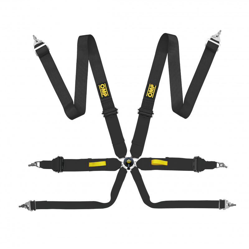 OMP TECNICA 3"+2" Sedan 6-Point Harness - Lightweight and comfortable safety harness for sedans in polyester fabric. Lightweight, high-strength steel and aluminum adjusters, solid machined ergal buckle, and magnesium. The harness guarantees the highest level of safety thanks to the ultra-resistant buckle with an anti-unconscious opening system and unique double-prong T-bar crotch straps. FHR only.