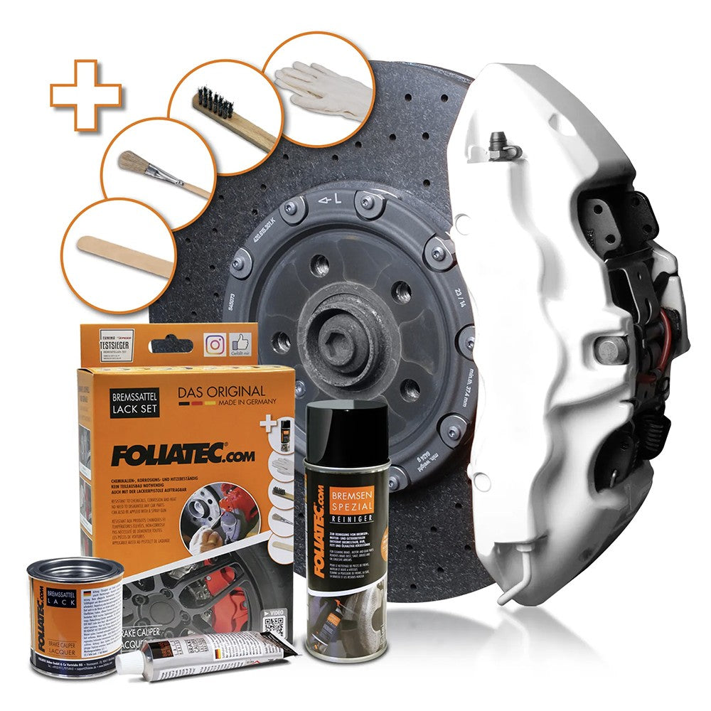 PRODUCT INFORMATION With the NEON brake caliper and brake caliper you give your vehicle a very individual and sporty look. It permanently seals and preserves the surface and is resistant to chemicals, corrosion and oil. It has a long-lasting shine and is easy to clean. With the included base coat, our NEON brake caliper displays an extremely intense luminosity. Set of 7 pieces or 10 pieces (for NEON colors) Heat-resistant Chemical-resistant, corrosion-resistant and oil-resistant Easy and precise application with a brush No need to dismantle any car parts Sufficient for 4 brake calipers Use NEON colors only with the included base coat TIP: Now also applicable with a paint gun due to our new dilution. The Brake Caliper Lacquer Set includes: Brake Cleaner, 400ml and 125ml paint as well as 50ml hardener Steel brush, brush, spatula, 1 pair of disposable gloves The NEON Brake Caliper Set includes: Brake Cleaner (400ml) + Basecoat (125ml) + Lacquer (125ml) + Hardener (50ml) 1 steel brush, 2 brushes, 2 spatulas, 1 pair of disposable gloves APPLICATION Remove the wheels. Clean the brake caliper with the included steel brush and the included Brake Cleaner. Mix the brake caliper paint and the hardening agent with the spatula. For NEON colors: Shake the white basecoat with the spatula and apply in a thin but well-covered layer with the first, fine brush. Use the second spatula to mix the NEON brake caliper paint and the hardening agent. Mask all parts except the brake caliper and apply the brake caliper paint with a brush. After painting the brake calipers, let them dry, then place the wheel in place. For further instructions, please read the APPLICATION sheet.
